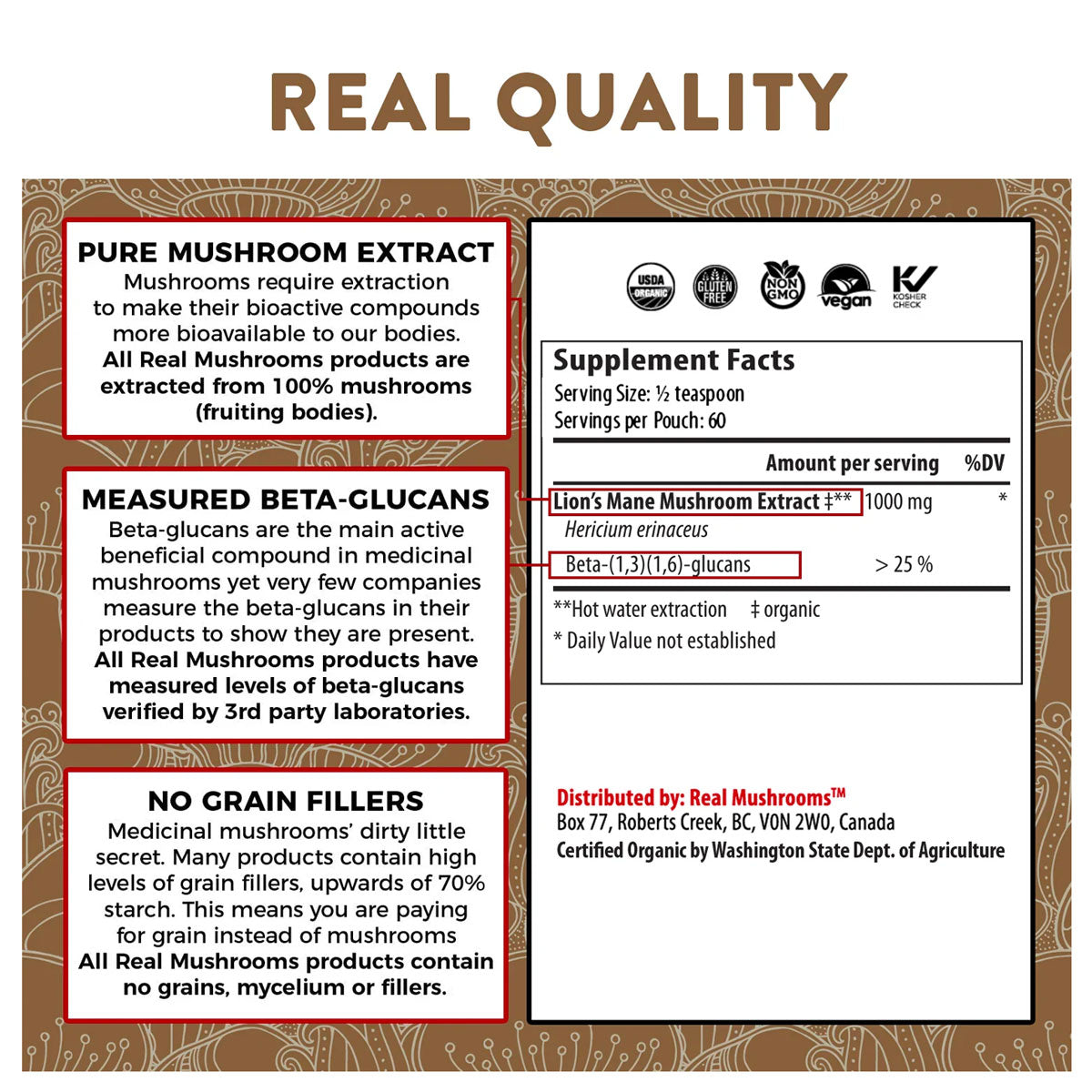 - Hot water extracted from 100% Lion's Mane mushrooms