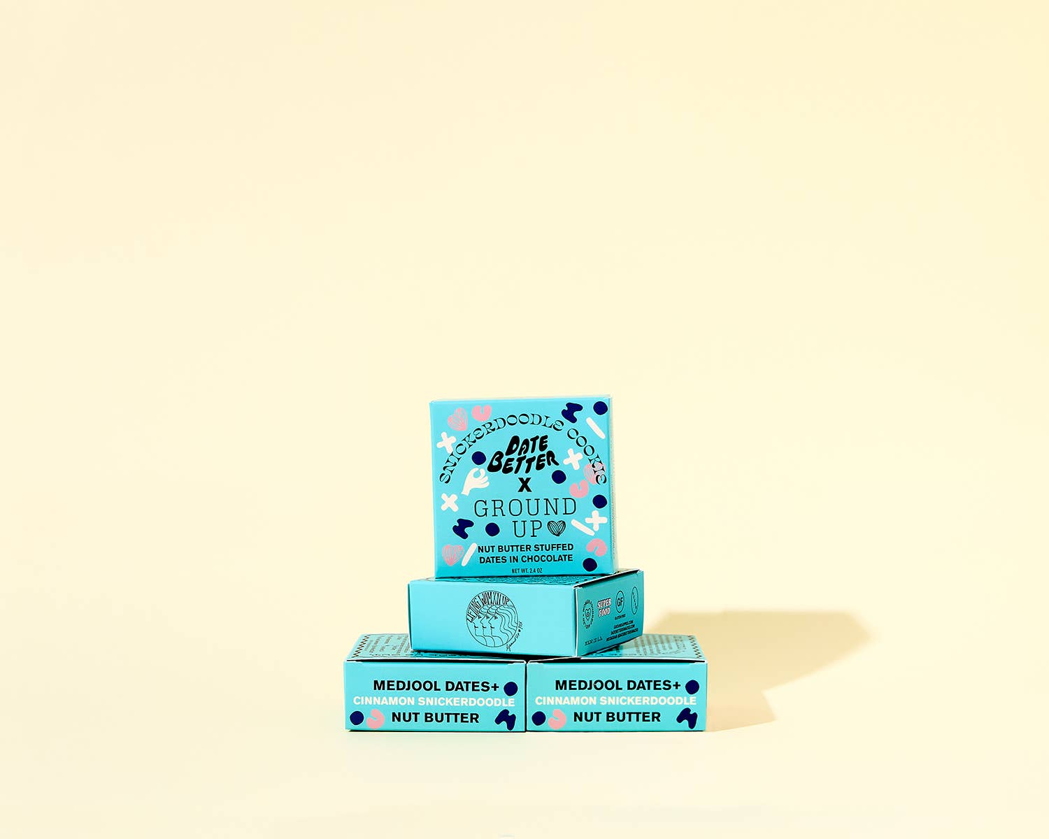 Snickerdoodle nut-butter stuffed, chocolate covered dates. Chewy Medjool dates are stuffed with our iconic Cinnamon Snickerdoodle Nut Butter, speckled with cinnamon dusted almond pieces. They are then enrobed in organic, fair trade 85% dark chocolate that is free from any soy or emulsifiers.